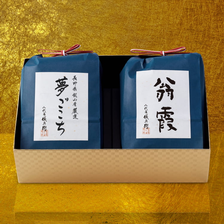 とろりとした濃厚な味わいと豊かな甘い香り、極上の希少米の「夢ごこち」。儀兵衛の最高峰「翁霞」との食べ比べをお楽しみいただけるギフトです。