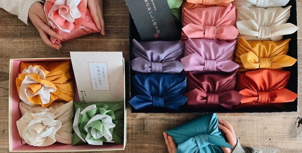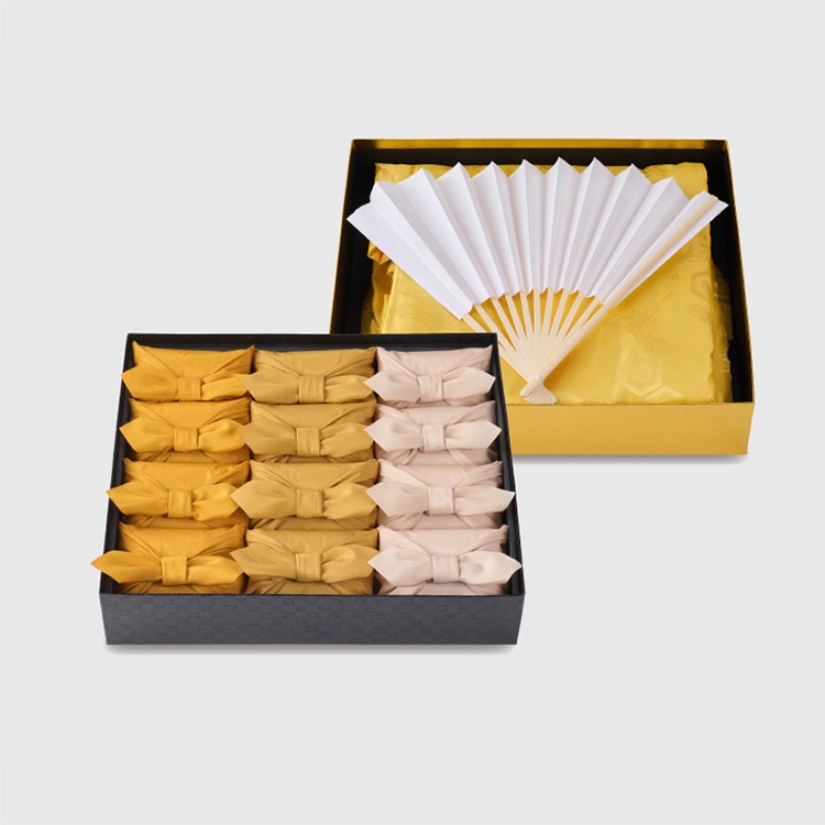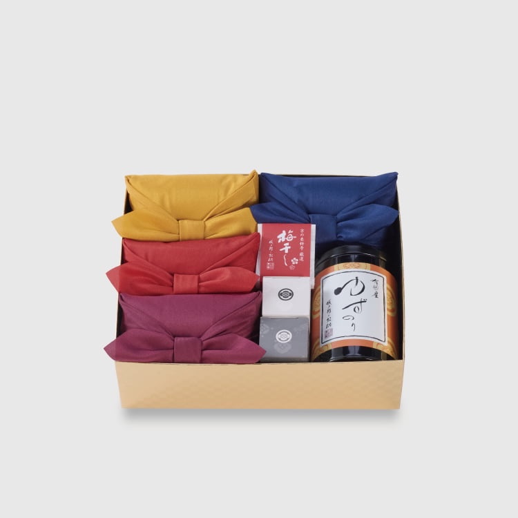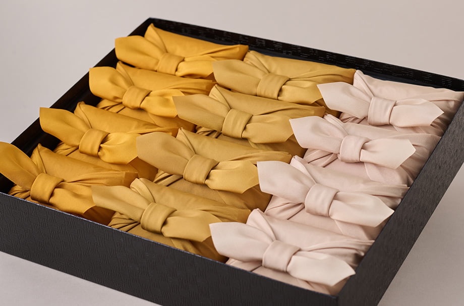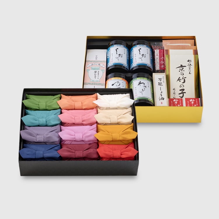 十二色の風呂敷包みは、知る人ぞ知る、古来より感謝の気持ちや願いが込められてきた京都の彩り。お世話になった方への贈りものとしてふさわしい、一つひとつが手包みされたギフトです。