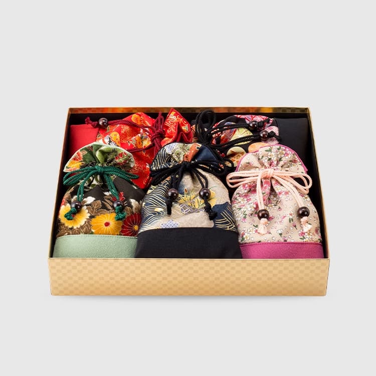 米寿のような慶事にふさわしい、熟練の職人の手仕事で作られたおしゃれな京ちりめんが華やかさを演出します。その艶やかさは見る人の心を明るく煌びやかにし、忘れられない想い出になります。味わい深い5種類の銘米が、日々の食卓をますます楽しいものへと変えてくれます。
