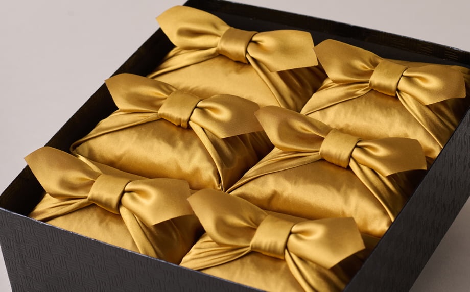 小判に見立てた金色の風呂敷包みの中には、食通も唸る最高峰のお米を、さらにその下にはごはんのお供をぎっしり詰合せた、思わずクスっと笑みがこぼれる仕掛けです。お祝いの場を和ませてくれる、ユニークな演出といえるでしょう。