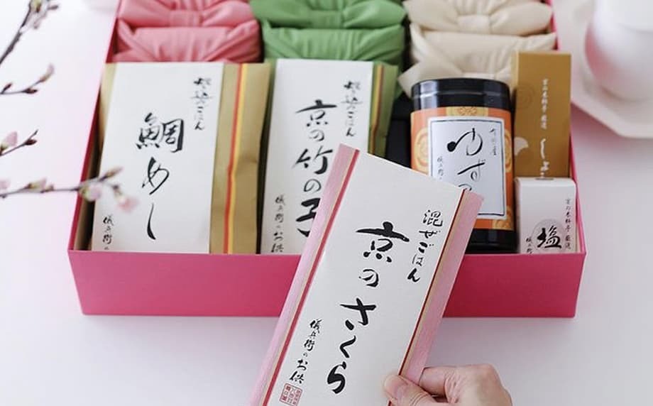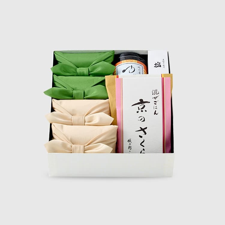 | ●ギフト内容 ・料理米2合×4個(和×2、煮×2) ・混ぜごはん「京のさくら」×1個 / 炊き込み「鯛めし」×1個 / ゆずのり×1個 / 塩×1個 |