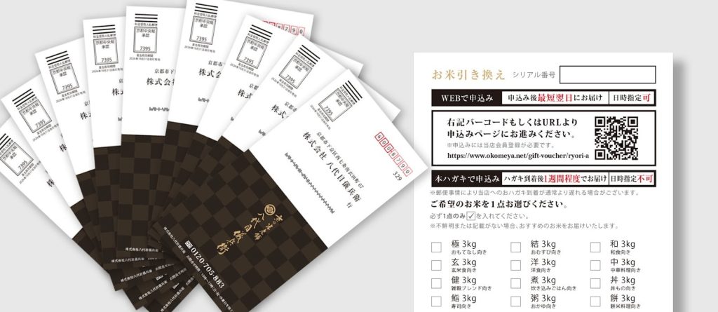 商品券やギフトカードのデメリットは、お相手に金額がはっきりと知られてしまうこと。八代目儀兵衛のお米券シリーズは、当店自慢の「料理米」と「お米券(商品券)」がセットになった特別なギフトです。