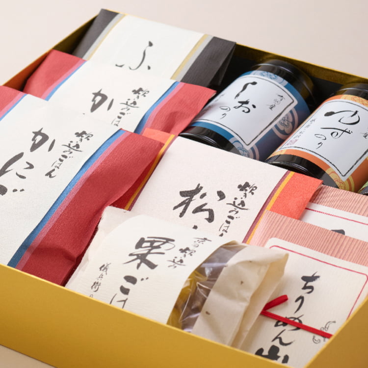 - 炊き込み「松茸めし」×1個 / 炊き込み「栗ごはん」×1個 / 炊き込み「かにごはん」×2個 /ふぐぞうすい×1個 / しおのり×1個 / ゆずのり×1個 / わさびのり×1個 / ちりめん山椒×1個 / ひじき梅×1個
